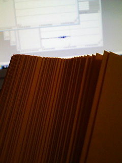 進行状況 a cappella 2007年11月19日 色々並行してやり過ぎてる。とりあえず完了してる分。●企画用小物。いざ、プリンタ出力完了したものの、でっかくて持ち歩きにくいのでとりあえず折った。わざわざだけど、折るのは仕事で慣れてるさ~。今回の参加者数はこんなに居ます。一見パスタにも見えるような…。●企画ステージ音源。今回はやっかいな企画に挑戦する事にした為、ご参加の出演者皆様にはご迷惑をおかけ中。とりあえずサンプルを作成中。これがまたデータが重くて大変。サンプルは出来たものの、データが重すぎてネット上にアップ出来ないでおる。(データの重さ関係なく、サーバーの状態が悪いかも?)これのせいで作業が停滞中。音源作ってるついでに別作業中。プログラムの仮データが届いたので確認中。