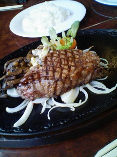いわて短角牛 travel&food 2010年02月27日 2月21日の日中土曜の移動中の話。金曜にka7さんが職場の講演で食関係の話を聞いてきたそうで、いわて短角牛は安全で且つ美味しいという事で、その話を聞いている内に「そんなに美味しいというなら食べてみたい」という事でランチに行く事に。扱っている店でやってるところ~と調べて、パイオニア牧場に行ってきた。ちょうどマシェリに載ったとかでお客さんが多く、明らかに手が回ってない感じ。高いからと中途半端にハンバーグとか食べてなんだかわからなくてもと思い、がっつりサーロインとフィレのステーキをセットで頼んだ。サラダと牛刺し、スープ、肉、デザートとコーヒー…全体の値段は高いけど、確かに美味しかった。大満足!!忙しいせいか、肉の量が多く来たり(間違えて切っちゃったらしい)思いがけないサービスが(^^;肉そのものについてはサーロインの方が脂が少なくあっさり目?これは意外だった…。とても贅沢したけど後悔はしない。