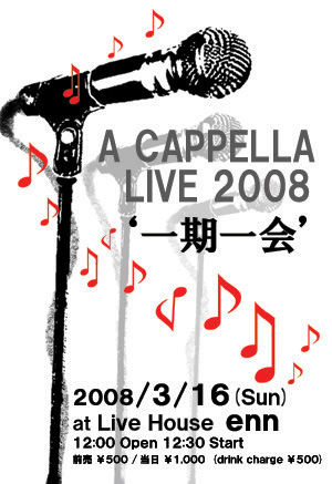 ライブ情報など information 2008年03月15日 昨日のブログいじりに続きINFORMATIONを更新。とりあえず現時点で決まってるお知らせをば。A CAPPELLA LIVE! 2008‘一期一会’既に明日となったが仙台のライブにアプリで参加させて頂く予定。夏頃からお誘い頂いていて実現した事とはいえ、世代のギャップもやや感じつつ、「もしや(アプリという)名前だけ先行してるのでは?」という不安も抱えながらの参戦(苦笑体力落ちてる事も心配に加え、昨晩の睡眠不足での運転も更に重なり、ただただ無事に終わればいいなと祈るのみ…。仙台のアカペラはこちらでやってるのと雰囲気が結構違うので勉強してきたいものである。日時:2008年3月16日(日) 12:00 OPEN、12:30 START場所:ライブハウスenn(宮城県仙台市)チケット:前売500円 当日1,000円(別途1ドリンク500円頂戴致します)※アプリは4番目の出演(トリ前なんですけど… (タイトル未定)にっか亭スピリッツアカペラライブスピリッツでアカペラと言えばアプリ!?と言って頂けると結構興奮する(笑そんな感じでいつもお世話になっているライブバーからこの辺で活動してるグループってどれくらい居るの?という質問に加えて「アカペラだけでやってみる?」とお声掛けて頂き実現。という訳で現在ライブ企画中…何しようかなー以前に「どこ出そうかな?」現在オファー中。個人的には「声の力」をテーマに打ち出そうかなと。実質自分達のライブに関しては、色々と諸事情があるので目新しい事は出来ないだろうけど、確実な成果はお見せしたいものである。期日:2008年4月27日(日)夜場所:にっか亭スピリッツ(岩手県盛岡市)チケット:1,500円(1ドリンク付き第4回 アカペラ ON Iwateまだ告知には早いかもしれないけど(汗)早数年前、「自分達のライブを作ろう」と仲間達でスタートさせた企画。2回ほど前に運営から引退したものの、前回諸事情により復帰。その分最後のひと絞りを加えつつ、お陰様で次世代に引き継ぐ事が出来た。これまでもたくさんの支持・協力を頂いて来たが、今回のボスは非常に頼れる模様だと既に推察中。して、当日見に行くのを楽しみにしていたのだが、嬉しい事に出演のオファーを頂き参加予定である。出演陣はすっかり様変わりし、新しいグループが勢揃い…アプリも古株だという事に気づく。私の誕生日の次日でもあるのでどうぞ祝って頂きたい(^皿^)日時:2008年5月18日(日) 14時開演場所:江釣子ショッピングセンター・パル 1F パルジョイスタジオ入場無料こんな感じでそろそろ春~。