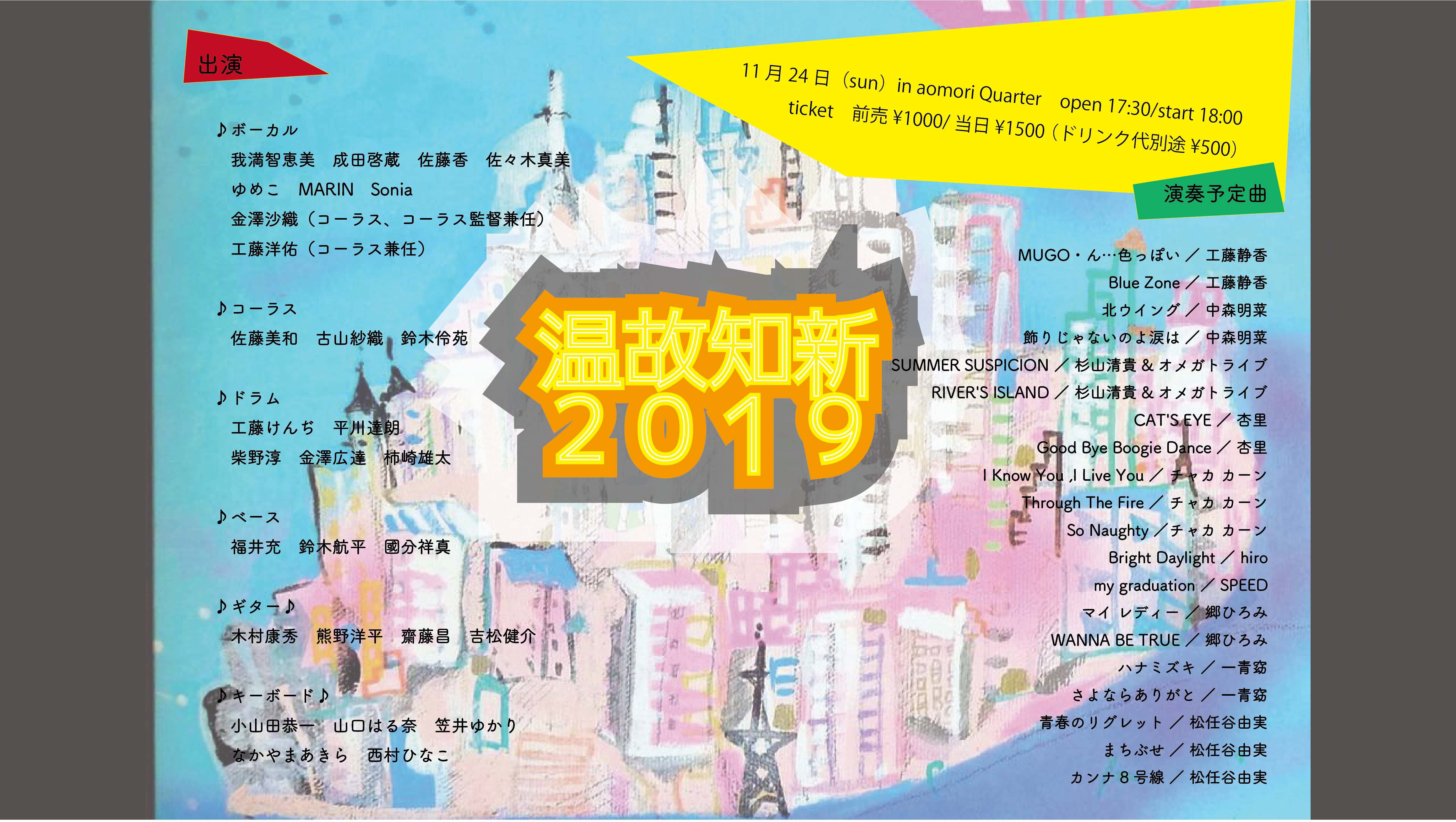 温故知新2019 information 2019年11月24日 温故知新2019日時:2019年11月24日(日) 開場17:30 開演18:00場所:青森県青森市/青森クォーター料金:前売1,000円/当日1,500円(ドリンク代別途500円)青森クォーターhttp://www.aomoriquarter.com/
