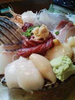 沖菜の刺身盛り travel&food 2008年03月25日 先に鮪だけ出してもらったので、鮪抜きの刺身盛り。しめ鯖は冷凍のしか食べた事がなかったので新感覚。あと鯨は肉だね…ほ乳類。エビはしばらく暴れてた。