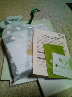 草花木果トライアルセット diary 2008年03月26日 携帯いじっててふらっと「草花木果」のトライアルセットを注文してしまった。なんとなく流れで(笑)で、届いたので1枚。買ったのは「よもぎ」で乾燥肌向け。サンプルも付いてきて、洗顔オイルと美容液?賛否両論っぽいので(結局は個人差)後で試してみよう。結果的にトライアルって旅行用になる可能性が高いのだけど…。 PR