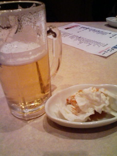 まるでサラリーマン風 travel&food 2008年03月17日 仙台一期一会は前日入りという事で、土曜の夜は仙台にてメンバー飲みとなりました。このお店、配置のせいか(というか個室ですし)どう撮っても寂しそうな写真になる訳です。寂しいついでにちょっと飲んだ中ジョッキとキャベツのお通しを撮ったら凄く寂しい感じに。とはいえ、このお通しのキャベツ、美味かったんです…。