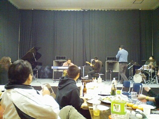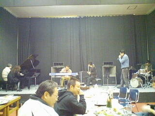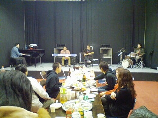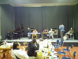 セッションとは? music 2007年12月17日 何やらセッションが始まった模様。ギターのO川さんとドラムのS輔くんが奏で始めます。おっと、先生は鍵盤もいけるんですね?おっとM澤さんも弾くんですか?M澤さん、ピアノを断念。突如「金のマイク」とハープを持ち込んで再度参戦。おっとちょうど隠れてしまいましたがA野さんがピアノで参戦しました。A野さんのピアノに更にT山さんも参戦。2人で弾いてます。おや、A野さん離脱。T山さんがピアノを弾きます。A野さん、今度はベースをもって再度参戦。熱いです!!Hくんもせっつかれてピアノ参戦です。激しい!!その後、Yちゃんがパーカッションで楽しく大暴れの、Mさんが踊りだし、のところで写真撮影に心がとがめてしまいました。私は何度か参加したものか悩みつつ、参加して最後まで付き合うのも、途中で離脱する勇気もなくて、結局最後まで観覧者でした(苦笑