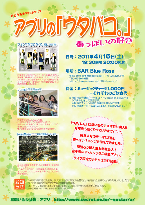 日時:2011年4月16日(土) 19:30開場 20:00開演 場所:岩手県盛岡市菜園/BAR Blue Rose http://bluerosemamo.web.officelive.com/ 料金:ミュージックチャージ1,000円+それぞれのご飲食代 ※当日のお会計は「キャッシュ・オン(cash on delivery)」システムとさせて頂きます。 入場時にチャージ料金1,000円を申し受けます。 その後はオーダーの度にお支払いをお願いします。
