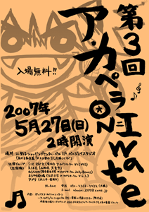 アカ鬼の季節です。 a cappella 2007年05月16日 岩手のア・カペライベントとして定着しましたアカ鬼3開催。今回は少々客観的な立場にて参加させて頂いてました(笑)●第3回 ア・カペラ ON Iwate日時:2007年5月27日(日) 午後2時開演場所:江釣子ショッピングセンター・パル 1F パルジョイスタジオ※岩手県北上市北鬼柳/東北自動車道「北上江釣子IC」を降りてすぐ入場無料出演/出演順に:SIX PACK(盛岡市ア・カペラサークルVOIVOI)RIZE(山形県天童市)Assam(岩手県立大学ア・カペラサークルJelly Beans)まろやか劇場(青森県弘前市 弘前大学ア・カペラサークルV.E.L.)アプリ(北上市・盛岡市)LFでお誘い頂いたのですが出られずで申し訳ないです。日程とかは無視して、気持ち的には参加出来たら良かったなとは思うのですが…。その分の枠はアプリの方に回ってきましたので、楽しく参加したいなと思っています。アプリはトリなそうだから、いいライブをしたいなー、しないとなーという感じでおる現在です。てか、運営も新体制で且つ出演者陣も目新しいグループばかりだから、どんなイベントになるんだ!?的に期待出来るイベントでございます。原点回帰やら新しい試みもあると思います。お買物のついでにどーぞ。
