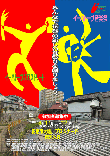出演者募集中! music 2007年05月21日 花巻を舞台にお送りする新しい「夏祭り」の形として、8月11、12日の2日間、「イーハトーブ音楽祭」が開催されます。野外ステージでのパフォーマンス「イーハトーブ音楽祭」自作のARTを展示販売出来る「ARTストリート」その運営をサポートする「サポート会員」以上、3つを通して祭りに、運営協力費の1人1,000円のみでいずれも参加出来ます。詳しくは以下をご覧下さい。イーハトーブ音楽祭 公式サイトhttp://ihatov.main.jp/m-fes/※募集要項は近日中にリンク出来るようにする予定です。その日に参加出来るか、何をやろうか、今の内に考えてて下さいませ! next... PR