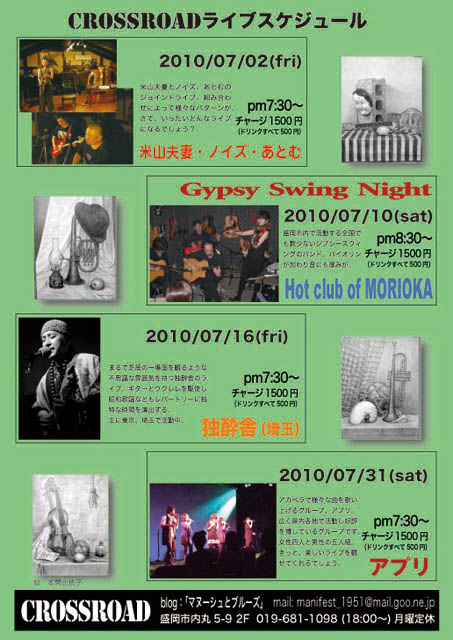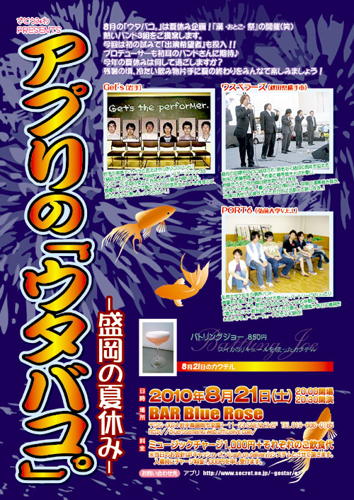 大量の告知 information 2010年07月29日 宣伝が多過ぎると何も言いたくなくなる事を実感中。久々に宣伝をします。SING UP! IN TOHOKU 2010ア・カペラフェスティバル 東北岩手日時:2010年10月3日(日) 11:00~17:00場所:岩手県北上市/アメリカンワールド内MJホールMJステージ観覧無料現在出演者募集中(締切8月12日)ライブ経験問わず、1曲からでも参加出来ます(応募多数の場合は選考あり)詳細はお問い合わせ下さい。http://iwateac.blog.shinobi.jp/まだそんなに集まってないので今なら問題なく出られるかも?応募お待ちしております。Live Bar CROSSROADライブ日時:2010年7月31日(土) 20:00~場所:岩手県盛岡市内丸/Live Bar CROSSROAD出演:アプリ(各1時間程度の2部公演)入場料:チャージ1,500円(ドリンク全て500円)桜山神社近くにあるライブバー「CROSSROAD」にてライブをさせて頂く事になりました。各1時間程度の2部公演になります。会場のキャパが小さいので、ご来場予定の方はあらかじめご連絡頂いた方が確実だと思います。北上みちのく芸能まつり協賛本通り1丁目商店街振興組合『歩行者天国』日時:2010年8月7日(土) 20:30~21:00場所:岩手県北上市/本通り1丁目特設ステージ(北上信用金庫前)観覧無料例年参加させて頂いている、北上芸能まつり協賛のストリートライブ。メンバー1人不在につき、Percussionのサポートをお願いして私はChorusやります。イーハトーブ音楽祭2010日時:2010年8月8日(日) 16:35~17:05頃場所:花巻市(駅前)/なはんプラザ 野外ステージ観覧無料2日目の終盤で出演します。うちの前がハードロックで、うちの後がヘビーメタルなそうで、アカペラがどこまで対抗出来るかが見ものとなっております。アプリの「ウタバコ。」 盛岡の夏休み日時:2010年8月21日(土) 20:30~ ※いつもより遅いスタートです場所:盛岡市菜園/BAR Blue Rose出演:Get's(岩手)、ウスペラーズ(秋田県横手市)、PORT6(青森県弘前市)料金:ミュージックチャージ1,000+それぞれのご飲食代今回は全部男性バンドの漢(おとこ)祭!打ち上げ参加希望の方は事前にご連絡頂けると助かります。Lost&Found ○年ぶりのライブ「One For All」日時:2010年8月28日(土) 19:30スタート場所:Rock Cafe' TOYS〒020-0021 盛岡市中央通1丁目7-16 モモトビル3階TEL 019-624-6202出演:Lost&Foundゲスト:KEN★DAI、ユキサオリ会費:¥3,000(ドリンクフリー&フード)※会場の都合により、定員に達し次第予約受け付けを終了致します。全員でそれなりのライブをするのは3年半ぶり。この時は盛岡・北上・宮城・関西・海外と居住地散り散りでしたが、今度は花巻・遠野・北上・山形・新潟に散り散りになっちゃいました。次はいつ出来るかわからないので、また一区切りのつもりで楽しみます。参加希望の方は私まで何かしらの方法でご連絡下さい。以降、9月4日(土)は北上9月12日(日)は仙台など予定しております(それは追って)