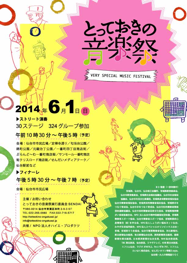 とっておきの音楽祭の参加について information 2014年05月01日 とっておきの音楽祭http://totteokino-ongakusai.jp/とっておきの音楽祭は、障害のある人もない人も一緒に音楽を楽しみ、音楽のチカラで、「心のバリアフリー」を目指す音楽祭…という事で、毎年仙台をはじめ各地で開催されているイベントです。参加しているアカペラサークルVoccoで出演する事になりました。出演時間とステージは下記の通り。11:35~12:00 サンモール一番町 シリウス一番町前宜しくお願いします。日時:2014年6月1日(日) ストリート演奏 10:30~17:00(予定) フィナーレ 17:30~19:00(予定)会場: 仙台市市民広場(フィナーレ会場にも使用)、定禅寺通り、勾当台公園、 一番町四丁目商店街、ぶらんどーむ一番町商店街、サンモール一番町商店街、 クリスロード商店街、せんだいメディアテーク1Fオープンスクエア、仙台駅前など(予定)