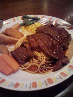 イタリアンカフェバンビーノ travel&food 2010年02月01日 イタリアンカフェバンビーノhttp://aw.michinoku-japan.com/bb/北上市北鬼柳・アメリカンワールド内安価でボリュームのある食事が食べたいと思い行ってきました。久しぶりに行ったもののメニューが増えている気もします。ステーキのソースは選べますが、やっぱりガーリックソースが一番かな?食後に頂いたフォンダンショコラも美味しかったです。