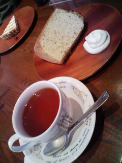 (紅茶専門店)tayhouse From K travel&food 2009年04月23日 以前から行ってみたかったtayhouse From Kというお店に行ってきた。カフェというか紅茶専門店。因みに「紅茶の香りを楽しむため」という意味で全面禁煙。最初にカップが選べる…ちょっと楽しい(笑)ケーキセットは紅茶から選ぶのでコーヒーの場合はケーキとコーヒーを注文する感じ。バナナシフォンは大きくてふわふわ~。紅茶も色も香りも○。広々とした静かなお店。1人で行ってものんびり出来そうな気がする。(入店しても「いらっしゃいませ~」ってのがないので戸惑う場合あり)時間が半端だったのでお茶しに行ったものの、外看板に書かれていたランチのスコーンプレートがかなり気になった。今度はランチにも行ってみよう。