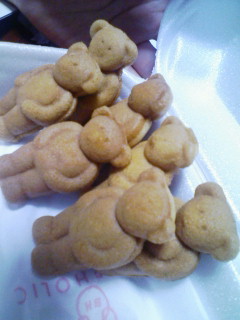 ベアホリックのベアケーキ travel&food 2009年04月14日 ベアホリックのベアケーキがカワトク(おめざフェア)で売っていたそうで、妹がおみやげに買ってきてくれました♪http://www.bearholic.com/朝、箱を空けたら片足のないクマが1匹残っていた…。(甥っ子が片足を食べたらしい)