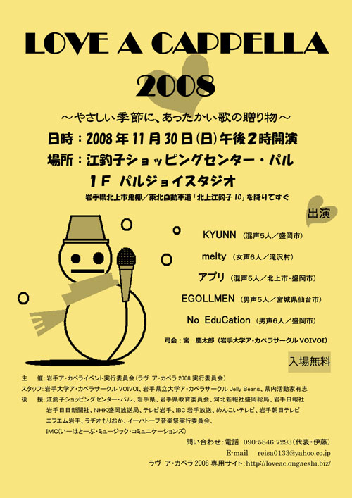 INFORMATION:11月30日 information 2008年11月12日 自分自身は特段11月は予定がいっぱいという事もないけど、体が休めていないせいか妙に忙しい感じ…。そんな訳で11月のライブのご紹介。岩手で活動しているアカペラー有志で企画運営している、パルライブの秋(冬)版「ラヴアカ」が開催予定で、私もアプリで参加させて頂ける事になりました。●LOVE A CAPPELLA 2008 ―やさしい季節に、あったかい歌の贈り物―【日時】2008年11月30日(日) 午後2時開演【場所】岩手県北上市/江釣子ショッピングセンター・パル 1F パルジョイスタジオ【料金】入場無料【出演】KYUNN、melty、アプリ、EGOLLMEN、No EduCation/出演順※アプリは3番目の出演になります。【お問い合わせ先】岩手ア・カペライベント実行委員会(代表 伊藤)reisa0133(@)yahoo.co.jpLOVE A CAPPELLA:http://loveac.ongaeshi.biz/春版が「アカ鬼」で、アカ鬼初回を開催した後「良かったら秋にもどうですか?」と言って頂き、では!と声掛けしたら周りは忙しいようで余り乗り気ではない模様。いいさー、私が好きにやるよ~と始めたのが開催のきっかけ。(私がやってなかったら開催自体なかったかも、なーんて) next...