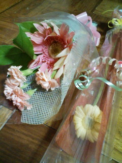 花束 diary 2008年09月30日 先日のライブの際に花束をもらった。以前、会社の人達が「花なんかもらっても嬉しくない」と言っていた。そんなのくれるぐらいなら金をよこせとの事(女性2名)個人的にはその花をどうするかはさて置き、(結果的に自分で処理せず花好きの母に渡して飾ってもらうので)私はもらって嬉しい方…なんとなく嬉しい。前に演奏会にエキストラで参加した際、一緒に演奏していた男性が打ち上げの帰りに「あげる」と1輪くれた時も妙に嬉しかった。その感覚は普通だと思ってたんだけど、一概にそうではないのかなぁ…。ずーっと飾ってられるものではないし食べられないけど、なんとなく嬉しいんだけど…。2人ともありがとー!