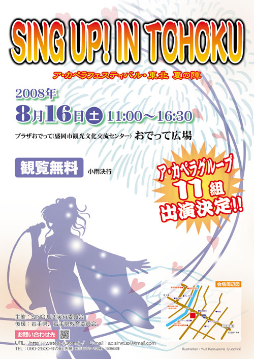 INFORMATION:8月16日 information 2008年08月04日 という訳で8月16日のイベントの詳細はこんな感じ。この度、ア・カペラや音楽の大好きな人達がひとつになれるイベントを目指し、アカペラの夏まつり「SING UP! IN TOHOKU」を開催する事に致しました。当日は岩手、秋田、山形より11組の参加が決定し、様々なステージがお楽しみ頂けるものと思います。たくさんのご来場をお待ちしております。●SING UP! IN TOHOKU/ア・カペラフェスティバル・東北 夏の陣日時:2008年8月16日(土) 11:00~16:30場所:プラザおでって・おでって広場(岩手県盛岡市)入場無料(小雨決行)主催:SING UP!実行委員会後援:岩手県、岩手県教育委員会※出演者、タイムテーブル他詳細はサイトをご覧下さい。http://iwateac.jugem.jp/+++対象を出演者にしているせいか、(私にしては普段と形が違うかも…汗)色々と出遅れている部分もあるのですが、あと2週間弱で間に合わせるぞー(おー!!という訳で、盛岡は舟っこ流しの日でもありますので、外出のついでにこっちにも遊びに来て下さい。